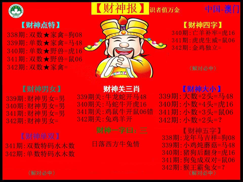 342期:澳彩宝典:3333226.com【致富三六九肖】开:?00中
