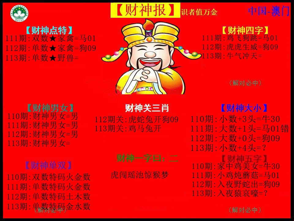113期:澳彩宝典:3333226.com【致富三六九肖】开:?00中